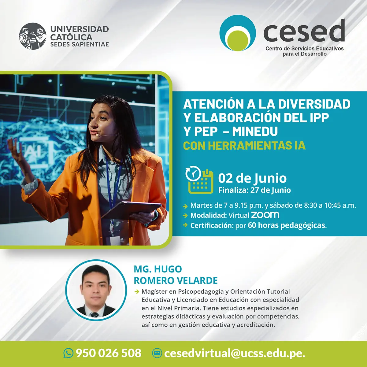 El curso “Atención a la diversidad y elaboración del IPP y PEP – MINEDU” tiene como propósito fortalecer las competencias docentes para comprender, analizar y aplicar el enfoque inclusivo promovido por el Ministerio de Educación, con especial énfasis en la atención a estudiantes en condición de discapacidad. En un contexto educativo caracterizado por la diversidad, resulta fundamental que los docentes diseñen respuestas pedagógicas pertinentes, flexibles y personalizadas que garanticen el derecho a una educación equitativa para todos. Este curso brinda herramientas conceptuales y prácticas para la elaboración del Plan Educativo Personalizado (PEP) y el Informe Psicopedagógico (IPP), en concordancia con la normativa vigente del MINEDU. Asimismo, promueve una intervención oportuna, democrática y de calidad, incorporando el uso adecuado de herramientas tecnológicas y digitales en el proceso educativo.